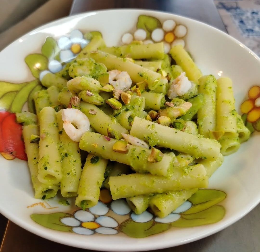 Pasta con pesto di zucchine, gamberetti e granella di pistacchi
